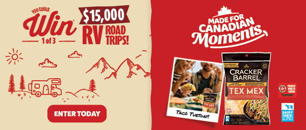 You could WIN 1 of 3 $15,000 RV road trips! Purchase any 2 Cracker Barrel or other participating products for your chance to win! Find out more details at : MyCanadianMoments.ca